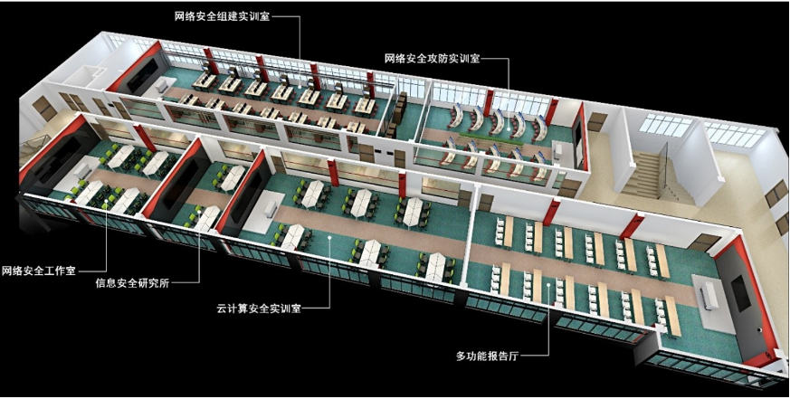 实训操作区域是学生,学生进行网络实训、安全实训的场所,主要包括网络安全组建实训室、网络安全攻防实训室及云计算安全实训室,中间服务器管理区是网络安全实训平台日常管理和设备维护管理的管理区域。